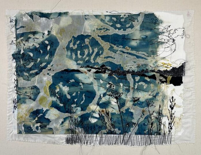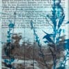Cyanotyped paper, with botanical-contact-printed paper appliqué, machine stitched thread. Mounted onto a background of natural denim, ready to be hung on a wall.